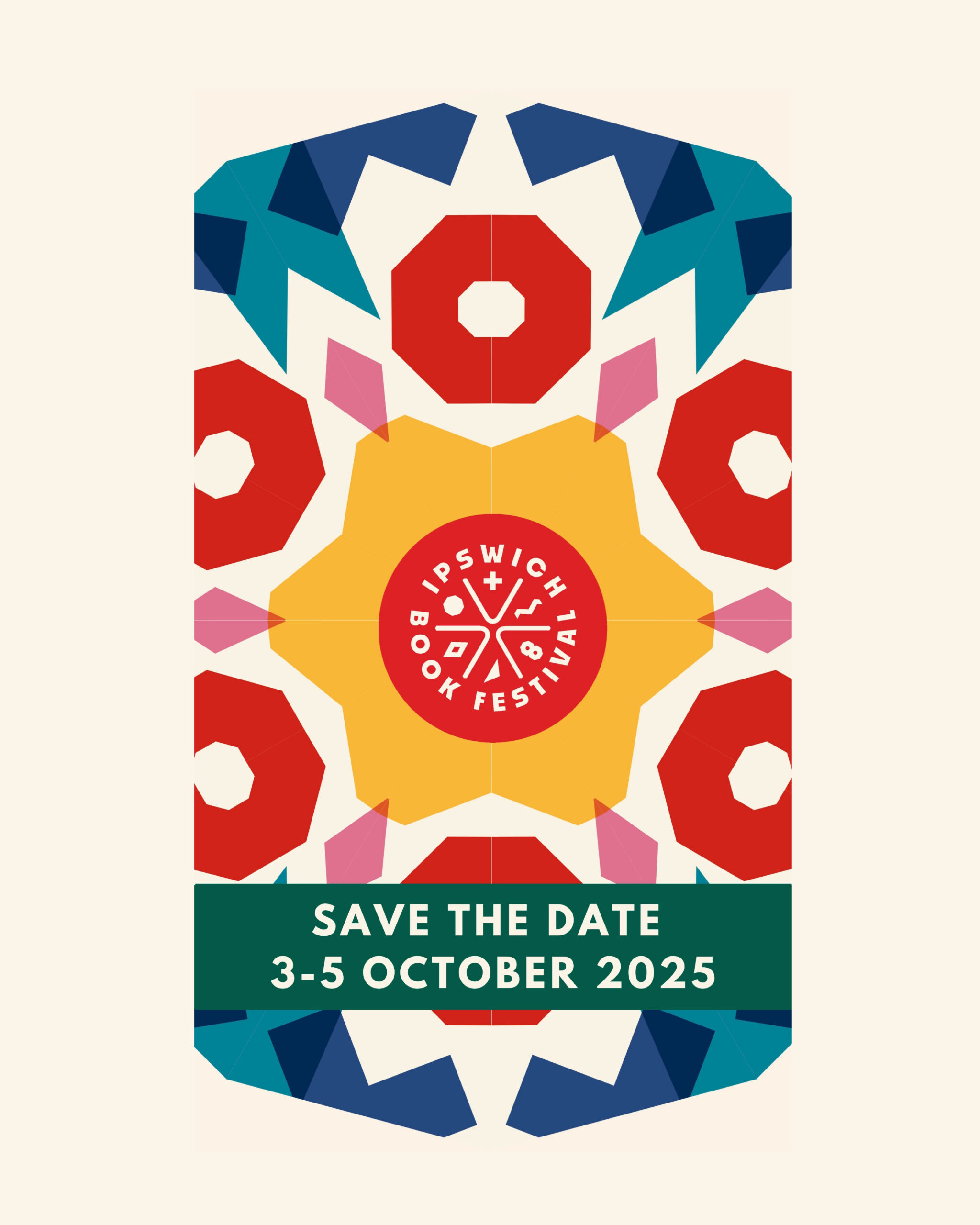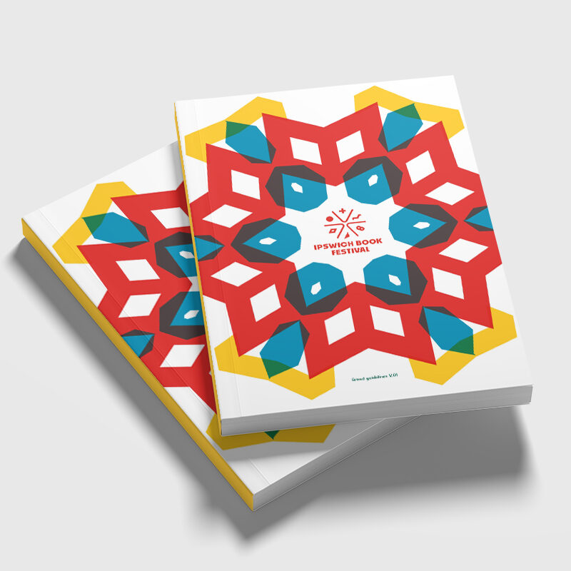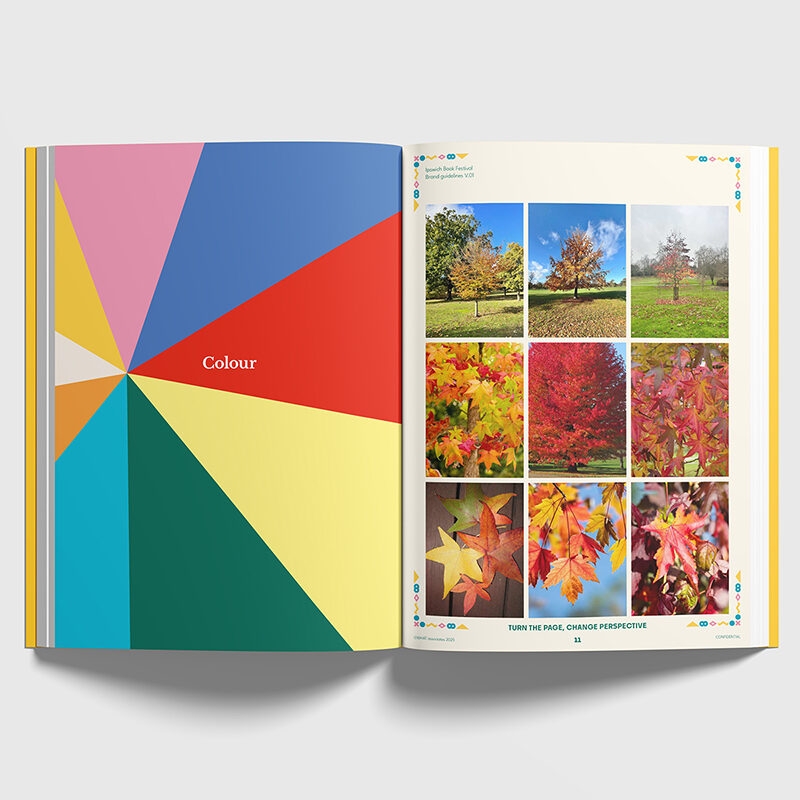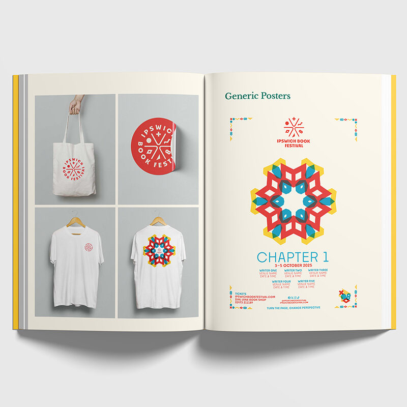 Working closely with the volunteer-led team, we helped define their values and purpose, laying a strong strategic foundation. Our discovery phase involved researching book festivals both locally and globally to ensure Ipswich could stand out with a unique, resonant concept. The Kaleidoscope concept celebrates the transformative power of stories. Books shift meaning with each reader, just as a kaleidoscope refracts light into endless new patterns. This metaphor shaped a bold, geometric logo of open-book elements forming a dynamic mark, paired with strong typography and a confident red to ensure visual impact. Icons inspired by Ipswich’s architecture represent six literary genres, forming the kaleidoscope’s vibrant segments. Colour is always an important consideration for us. Drawing inspiration from Ipswich’s own Liquidambar tree in Christchurch Park, we developed a vibrant, autumnal palette to reflect the festival’s October timing, symbolising transformation and creative energy. It’s on fire (red!) in Autumn.