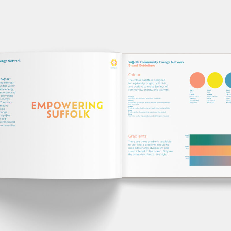 The identity uses a bright, optimistic colour palette and a friendly geometric typeface, designed to feel modern, inclusive and action-oriented. The strapline “Empowering Suffolk” expresses the brand’s purpose: to strengthen communities through sustainable energy.